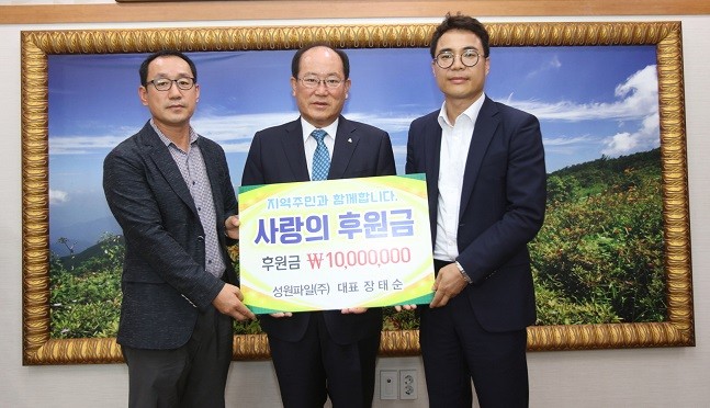 [세계로컬신문 김수진 기자] 충북 단양군 매포읍 산업단지에 위치한 장태순 (주)성원파일 대표가 지난 26일 단양군을 방문해 어려운 이웃을 위해 써달라며 1000만 원을 전달했다.