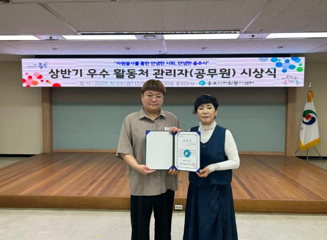 2025년 상반기 자원봉사담당 우수 공무원 선정 및 시상은 자원봉사 프로그램의 효과적 운영과 활성화에 기여한 충주시 관내 25개 읍·면·동 행정복지센터 및 실과소 자원봉사담당 공무원을 말하며, 선정기준은 1365 자원봉사 포털시스템 활용여부, 자원봉사자의 봉사실적 관리, 활동처 관리자 의무교육 이수 등 객관적 평가 기준에 따라 선정되며, 상‧하반기 연 2회로 선정하여 자원봉사자 기본교육 때에 시상을 하고 있다.