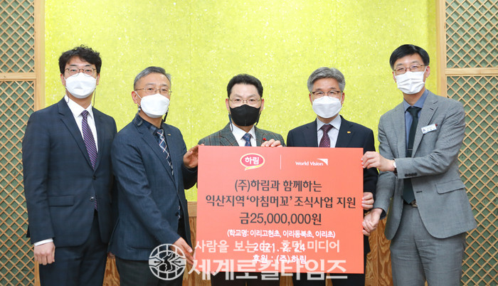 24일 하림에 따르면 이날 전북 익산교육지원청에서 하림 박길연 대표이사를 비롯해 월드비전 나윤철 본부장, 익산교육지원청 이수경 교육장이 참여한 가운데 ‘아침머꼬’ 프로그램 협약식이 진행됐다.