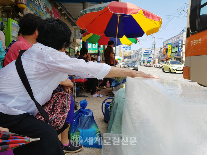 [세계로컬신문 조주연 기자] 2일 오전 전북 김제시의 한 버스정류장에 대형 얼음덩어리가 등장했다. 연일 이어지는 폭염 속에 김제시 안전총괄과측이 버스를 기다리는 시민들을 위해 가져다 놓은 것으로 보인다.