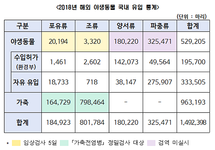 기존 일부 야생동물(약 37%)만 수입허가를 받아 관리해왔지만 현재 허가대상이 아닌 야생동물도 신고제 신설 등을 통해 관리하겠다는 것이다. 지난 2018년 기준 전체 해외유입 야생동물 53만 마리 중 수입허가 대상은 약 20만 마리에 그쳤다.