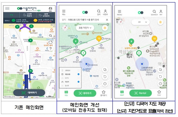 최근에 이용한 대여소, 내 주변 대여소 정보를 새롭게 제공하고, 이용권 구매 같이 자주 사용하는 기능을 전면에 배치하는 등 메인메뉴 구조를 개선했다. 비회원 대여 등 이용자들이 자주 묻는 내용을 ‘상황별 안내가이드’로 제공해 초보자도 쉽게 따라할 수 있다.