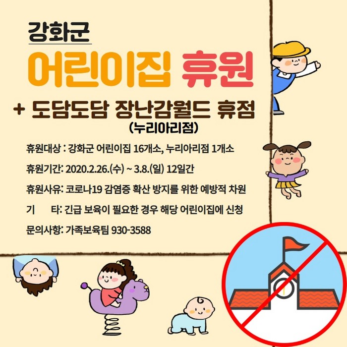 강화군에는 아직 확진자가 없지만 인근 자치단체에서 확진자가 발생함에 따라 선제적 예방조치로 어린이집 14곳에 대해 26일부터 3월 8일까지 휴원 조치했다.