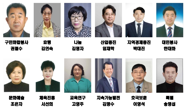부문별 수상자로는 ▲구민화합봉사 부문 권철수(남, 69세) ▲효행 부문 김연숙(여, 75세) ▲나눔 부문 김명자(여, 66세) ▲산업증진 부문 임재학(남, 51세) ▲지역경제증진 부문 박대진(남, 54세) ▲대민봉사 부문 한대화(남, 34세) ▲문화예술 부문 조은자(여, 63세) ▲체육진흥 부문 서선희(여, 66세) ▲교육연구 부문 고영주(여, 48세) ▲지속가능발전 부문 김명수(남, 67세) ▲호국보훈 부문 이영석(남, 77세) ▲특별 부문 송명섭(남, 61세) 등이다.