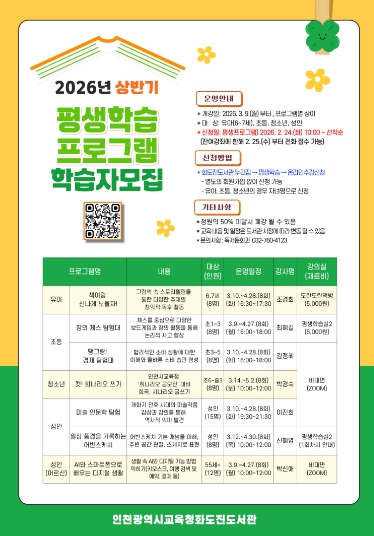 [세계로컬타임즈] 인천광역시교육청화도진도서관은 시민의 다양한 학습 수요를 충족하기 위하여, 오는 24일부터 ‘2026년 상반기 평생학습프로그램’학습자를 모집한다.