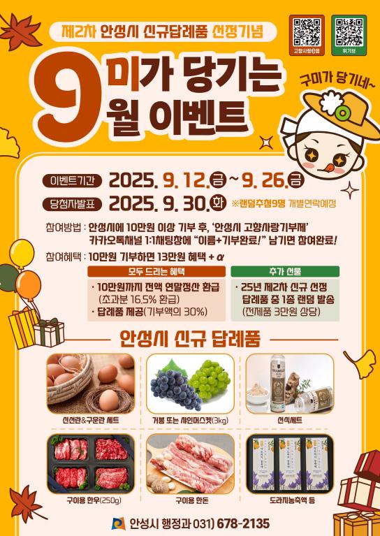 경품은 이번에 새롭게 선정된 안성포도, 구이용 한우 등 총 6종의 신규 답례품 가운데 하나이며, 추첨을 통해 총 9명의 당첨자에게 제공된다. 당첨자는 오는 9월 30일 발표될 예정이다.