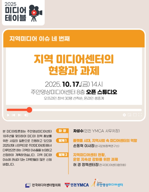 발제에서는 ▲플랫폼 시대, 지역 사회에서의 미디어센터 역할, ▲운영 지속성 강화를 위한 과제 등이 제시되며, 이어지는 토론에서는 ▲지속 가능한 운영 재원 확보 방안, ▲지자체와 미디어센터 간 정책적 연계 방안이 논의될 예정이다.