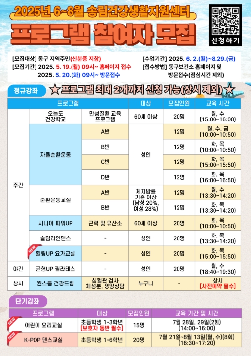 프로그램 참여는 동구 주민을 대상으로 하며, 인터넷 접수는 오는 19일부터 동구보건소 홈페이지에서 가능하다. 현장 접수는 오는 20일부터 송림건강생활지원센터에 방문하여 신청할 수 있다.