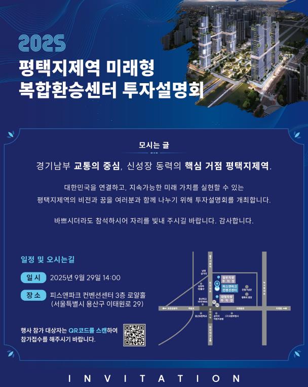 정장선 평택시장은 “평택시는 더 이상 과거의 작은 도시가 아닌 대한민국에서 가장 빠르게 성장하는 기회의 도시이며, 오는 투자설명회가 평택지제역이 ‘대한민국 교통과 경제의 새로운 랜드마크’로 탄생하는 계기가 될 것”이라며 “새롭게 변모할 평택지제역의 모습을 함께 그려나가길 기대한다”라고 전했다.