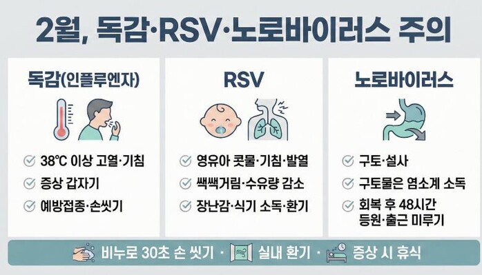 평택시 송탄보건소 관계자는 “비누로 30초 이상 손 씻기, 기침 예절, 실내 환기, 증상 시 휴식 등 기본 수칙이 감염 확산을 줄이는 가장 확실한 방법”이라고 강조했다. 이어 “특히 발열·기침이나 구토·설사 증상이 있으면 등교·출근을 미루고, 증상이 심하거나 고위험군은 조기에 진료를 받는 것이 안전하다”고 당부했다.