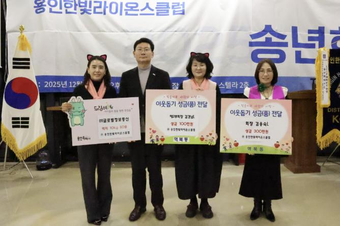 이번 기탁은 용인한빛라이온스클럽의 2025년 송년회를 맞아 마련됐으며, 김용숙 회장(성금 300만 원), 김경님 제2부회장(성금 100만 원), 박은정 회원(백미 10kg 50포)이 참여해 성금 400만 원과 물품을 전달했다.