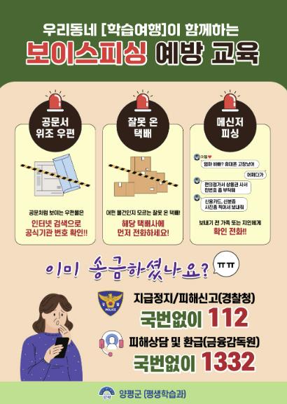 전진선 양평군수는 “보이스피싱은 전화 한 통, 문자 하나로도 일상을 위협할 수 있다”며, “어르신들이 사기 전화에도 당황하지 않고 대처할 수 있도록 교육을 지속적으로 확대해 나가겠다”고 밝혔다.