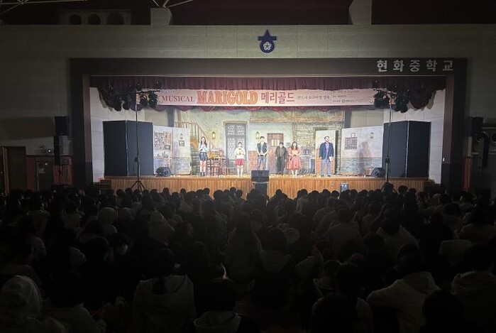 지난 10월 1일과 22일 ▲동일공업고등학교 ▲현화중학교에서 진행된 뮤지컬 '메리골드'는 옴니버스 형식으로 구성되어, 서로 다른 사연을 지닌 인물들의 이야기를 통해 청소년들이 가족과 친구, 그리고 자신의 삶을 되돌아보며 생명의 소중함과 공감의 가치를 느낄 수 있도록 기획됐다.