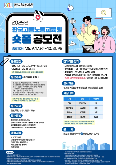 총 16명에게 390만 원 규모의 상금이 수여되며, 출품 주제는 ▲노동법과 노동상식을 쉽게 전달하는 콘텐츠 ▲노사 갈등을 대화와 협력으로 풀어낸 드라마 형식 영상 ▲직장 내 괴롭힘 예방 등 교육원 주요 교육의 중요성을 강조하는 홍보 영상이다.