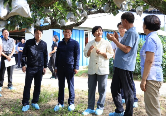 이날 배 농가를 방문한 송미령 장관은 농업인들에게 “지난 장마철 집중호우, 폭염에 대응하여 철저한 과원 관리와 적기 병해충 방제에 노고가 많으신 농업인분들에게 감사하다.”라며 전하고, “고온 피해 예방을 위해 주기적으로 열매 성숙 상태를 확인 후 수확시기를 결정하여 장기 저장용 배는 조기 수확하고, 추석 성수품용 배는 적정 시기에 수확하도록 당부한다.”고 밝혔다.