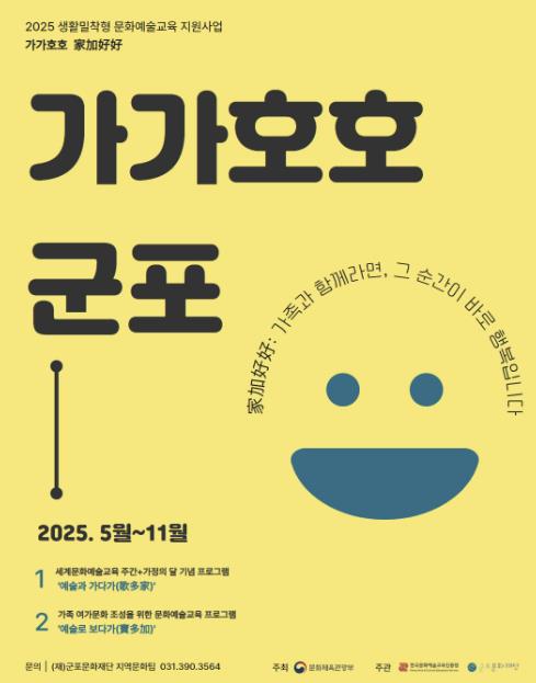 ‘가가호호 군포’는 다양한 가족 유형에 맞춘 생활밀착형 문화예술교육을 통해 건강한 여가 문화를 조성하고자 기획됐다. 세계문화예술교육주간과 가정의 달을 맞아 오는 5월 31일 홍보형 기획 사업 ‘예술과 가다가(歌多家)’를 시작으로, 6월부터 11월까지 총 7개의 가족 참여형 프로그램 ‘예술로 보다가(寶多加)’를 운영할 예정이다.