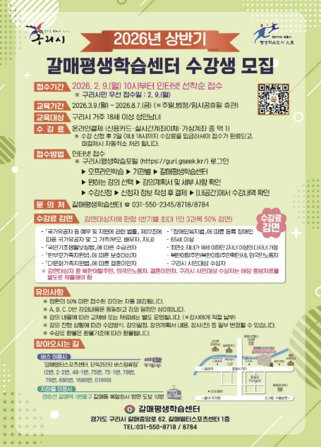백경현 구리시장은 “급변하는 시대 변화에 대응해 자기 계발과 문화적 소양, 미래 역량 강화를 균형 있게 지원하는 다양한 강좌를 마련했다”라며 “모든 시민에게 폭넓은 평생학습 기회를 제공해 삶의 질을 높이고, 시민의 내일이 기대되는 도시를 만들어 나가겠다”라고 말했다.
