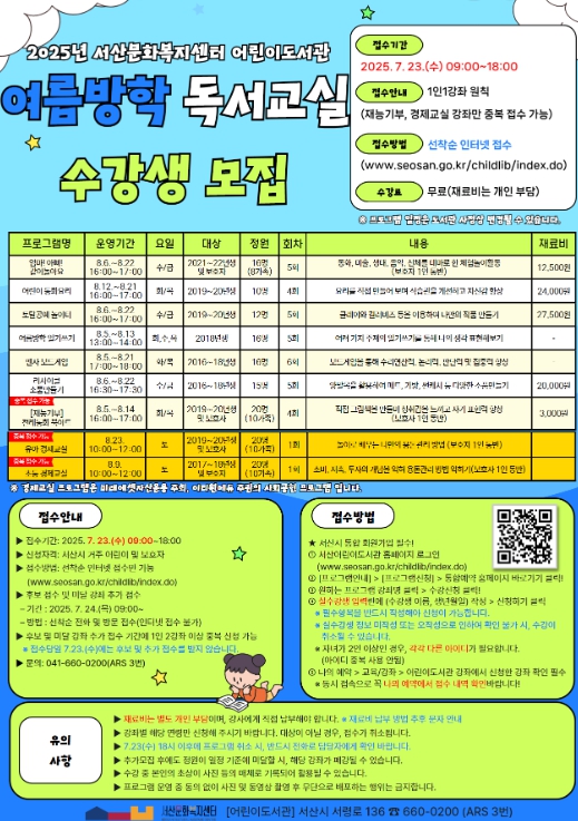 수강 신청은 어린이도서관 홈페이지 통합예약시스템을 통해 7월 23일 오전 9시부터 오후 6시까지 선착순으로 모집하며, 보다 자세한 사항은 홈페이지나 전화를 통해 확인할 수 있다.