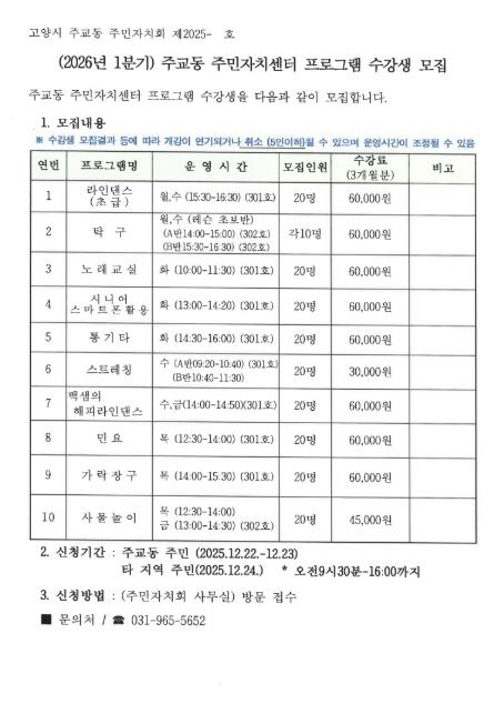 새해를 맞아 운영되는 강좌는 총 10개로, 주민들에게 꾸준히 인기를 얻고 있는 건강 증진 프로그램(▲스트레칭 ▲라인댄스 ▲탁구 등)과 스마트폰 사용에 어려움을 겪는 시니어층을 위한 스마트폰 강좌가 계속 운영된다.