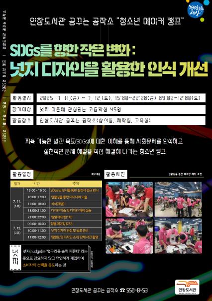 캠프 1부에서는 넛지 이론의 핵심 개념과 실제 적용 사례를 학습하고 팀별 토론을 통해 ‘기후 변화 대응’을 위한 아이디어를 도출하며, 꿈꾸는 공작소의 장비를 활용하여 도서관 방문자들의 참여를 유도하는 참신한 넛지 디자인 시제품을 제작한다.