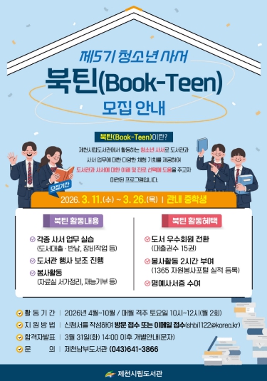 박상천 제천시립도서관장은 “청소년 사서 북틴 활동을 통해 청소년들이 도서관과 사서에 대한 이해를 넓히고 진로 선택에 도움이 되길 바란다”라고 말했다.