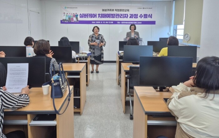 '실버케어 치매예방관리자 과정'은 여성가족부와 김포시가 사회복지사, 간호(조무)사, 요양보호사 등의 자격증을 소지한 미취업 경력보유여성 20명을 대상으로 진행한 직업교육훈련으로 ▲노인인지행동검사 ▲노인인지행동치유(음악, 미술, 독서, 원예) 등의 과정을 통해 현장 맞춤형으로 교육을 진행했다.