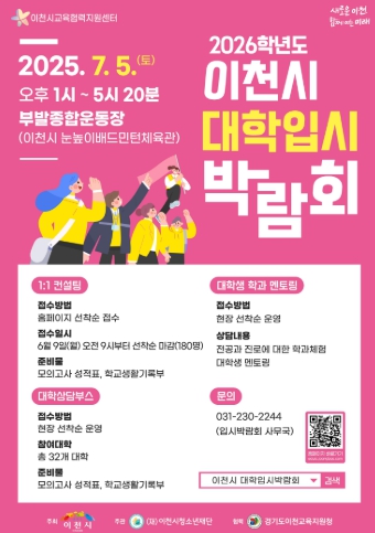 김경희 이천시장은 “두 번째로 맞이하는 ‘2026학년도 대학입시 박람회’가 이천시 학생들에게 대학 입시 관련 최신 정보를 반영한 개인 상황에 맞는 전략과 진단을 제공받을 수 있도록 대입 진학을 적극 지원할 것”이라고 말했다.