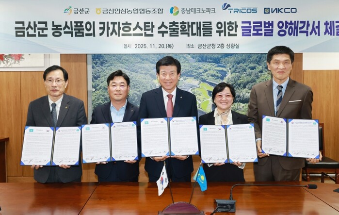 군 관계자는 “이번 협약을 통해 금산군 농식품이 카자흐스탄 시장을 넘어 중앙아시아 전역으로 확장할 수 있는 가능성을 보여줬다”며 “금산군 농식품이 글로벌 시장에서 경쟁력을 갖출 수 있도록 노력하겠다”고 말했다.