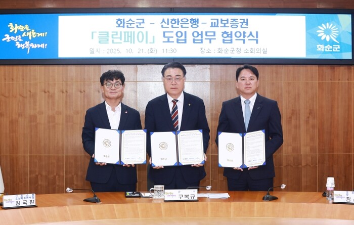[세계로컬타임즈] 화순군은 공정한 계약 문화 정착과 원활한 대금·임금 지급을 위해 신한은행, 교보증권과 차세대 전자적대금지급 시스템인 ‘클린페이’ 도입을 위한 업무협약을 체결했다고 밝혔다.