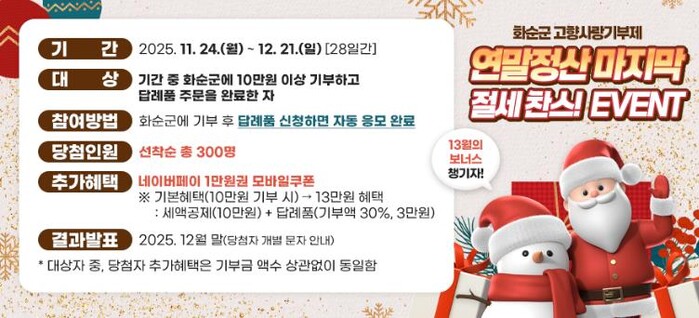 [세계로컬타임즈] 화순군은 연말을 맞아 고향사랑기부제 ‘연말정산 마지막 절세 찬스!’ 이벤트를 오는 11월 24일부터 12월 21일까지(28일간) 진행한다고 밝혔다.