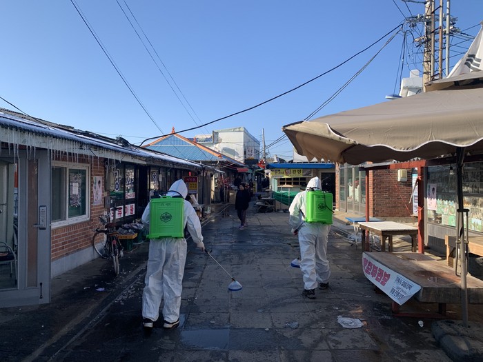 | ▲ 공무원 관계자들이 대룡시장 입구부터 방역을 실시하고있다. (사진=강화군청 제공) |