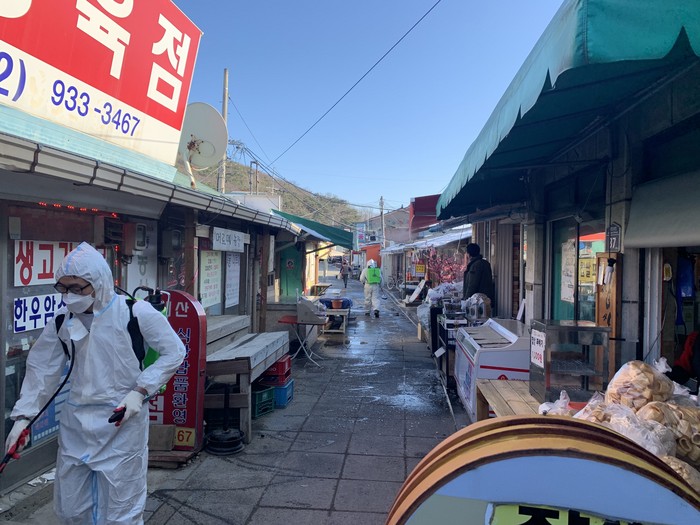 | ▲ 강화군 교동면의 대표 관광지인 대룡시장을 코로나19바이러스 차단 방역을 하고 있다. (사진=강화군청 제공) |