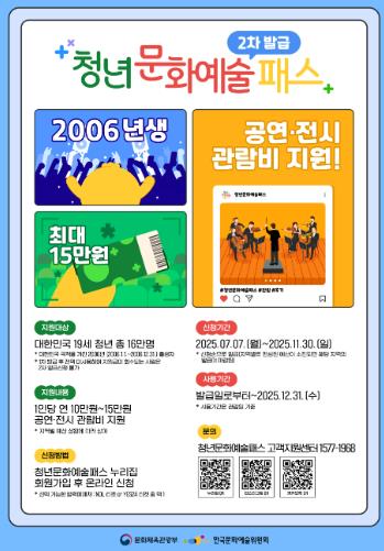 ‘청년문화예술패스’ 사업은 사회에 첫발을 내딛는 청년들에게 문화예술 향유 기회를 제공하기 위해 예술 분야 공연(연극, 뮤지컬, 클래식, 오페라, 발레, 무용, 합창, 국악 등)과 전시 관람비를 연간 최대 15만 원 지원하는 사업이다.