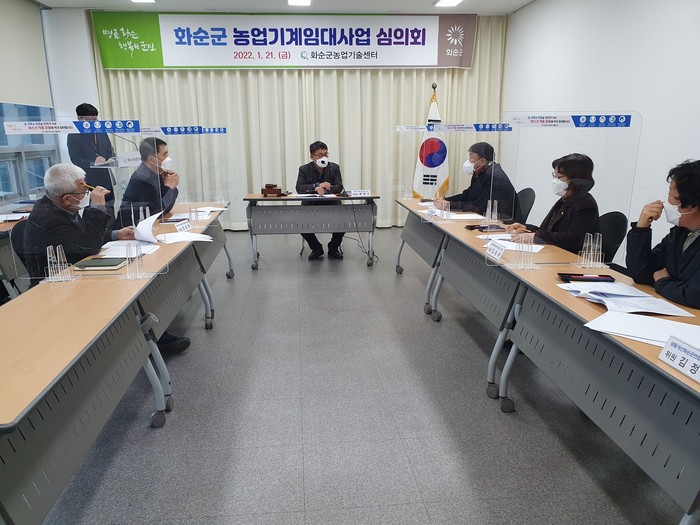 | ▲지난 21일 류창수(사진 가운데) 화순군농업기술센터 소장과 농업기계임대사업 심의위원 5명이 참석한 가운데 열린 농업기계임대사업 심의위원회에서 안건을 심의하는 모습. (사진=화순군) |