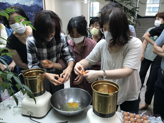 | ▲ '행복한 학교 텃밭·정원 가꾸기' 직무연수에 참여한 초등교원들이 천연살충제를 만들고 있다.(사진=대구시농업기술센터 제공) |