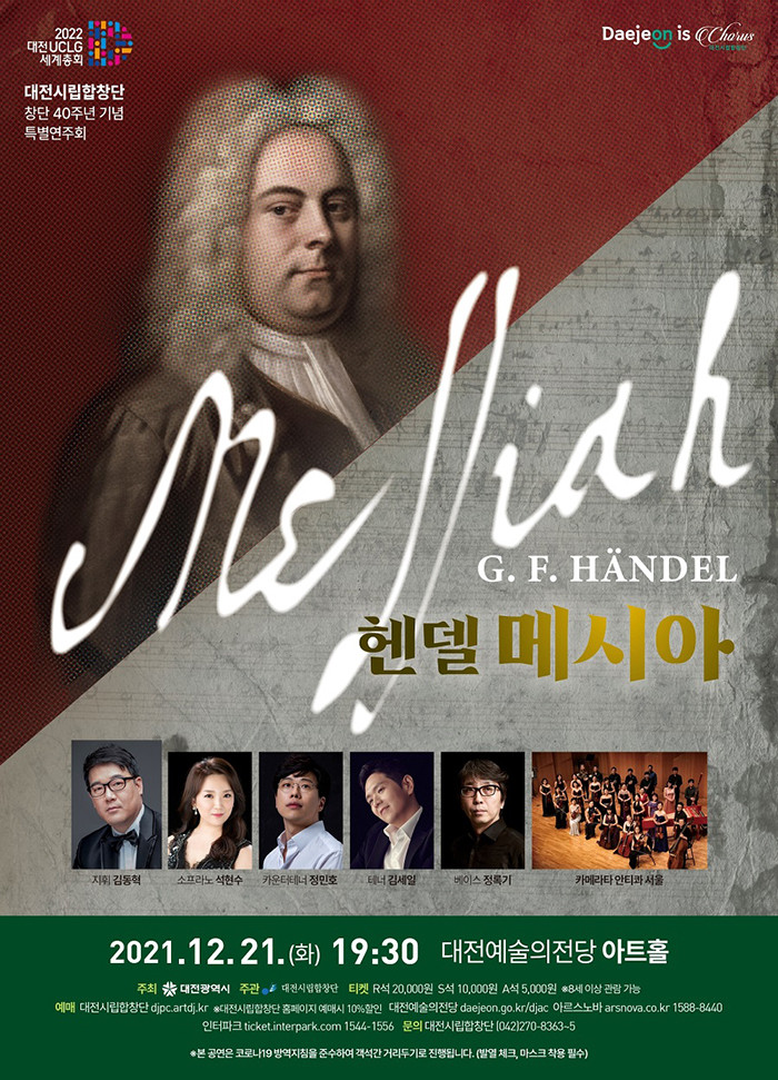 이는 지금도 전 세계 음악 애호가들로부터 가장 많은 사랑을 받고 있는 이유다. 김동혁 전임지휘자는 “코로나 19로 어렵고 힘든 시기, 대전시립합창단이 전하는 ‘메시아’는 헨델이 전달하고자 했던 따뜻하고 숭고한 울림과 위로를 주는 귀한 시간이 될 것으로 기대한다”고 말했다.