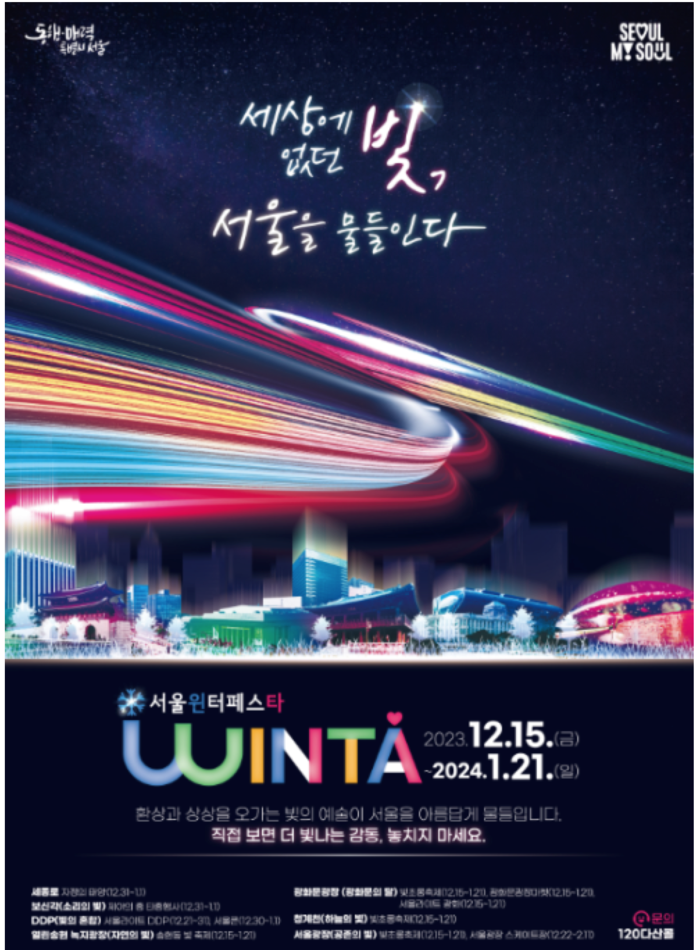 이번 축제는 ‘세상에 없던 빛, 서울을 물들인다’는 슬로건 아래 ‘빛’을 공통 소재로 15일부터 2024년 1월 21일까지 미디어아트, 빛 전시 등을 통해 서울의 겨울밤을 화려한 빛의 향연으로 물들인다.