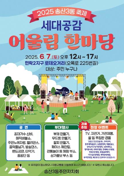 주민 노래자랑, 전통놀이 및 어린이 대상 체험 부스, 문화공연, 자매결연지 직거래장터 등 ‘세대공감 어울림’이라는 주제에 맞게 어린이부터 노인까지 모든 세대가 함께 즐길 수 있는 다채로운 프로그램이 준비돼 있다.