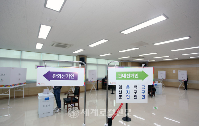[세계로컬신문 조주연 기자] 8일부터 6·13 지방선거 사전투표가 진행되고 있는 가운데 전북 김제시 검산동 주민센터 2층에 설치된 사전투표소 내에 관외선거인과 관내선거인을 안내하는 표지판이 방문객을 맞이하고 있다.