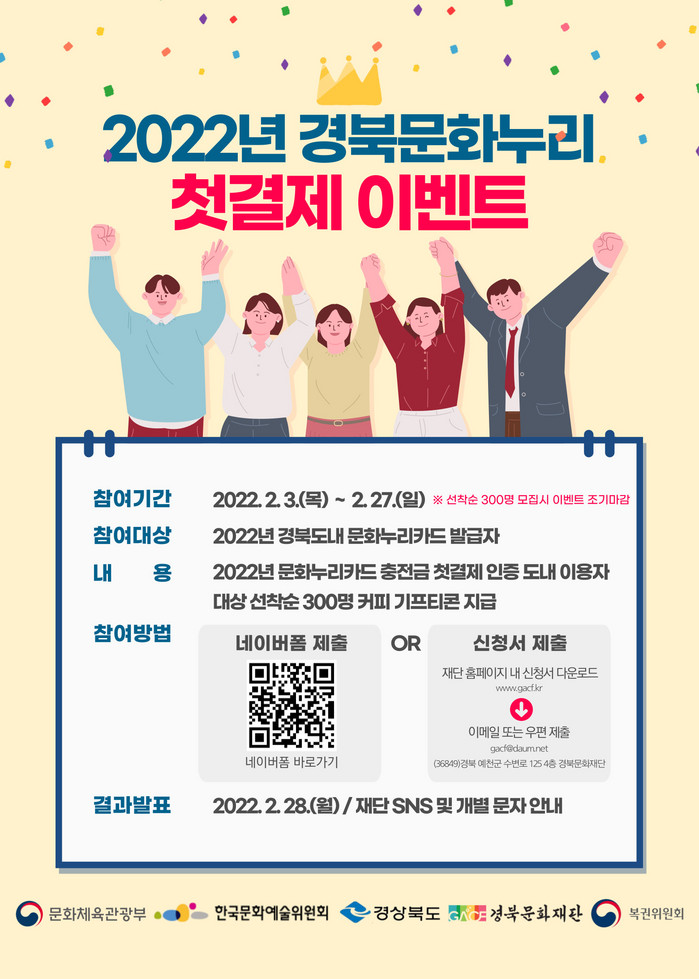 참여방법은 2022년 문화누리카드 충전금을 첫결제 내역을 문화누리카드 홈페이지의 카드사용 및 잔액확인 화면이나 휴대폰 카드승인문자로 캡쳐해, 경북문화재단 홈페이지에서 내려 받은 신청서 양식에 작성한 후 담당자 이메일로 제출하면 된다.