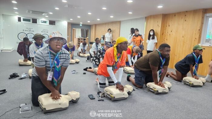 | ▲ 지난 9일 용인소방서를 방문한 나미비아 스카우트 잼버리 대원 28명이 용인안전체험관에서 심폐소생술체험을 하고 있다. (사진=용인소방서) |