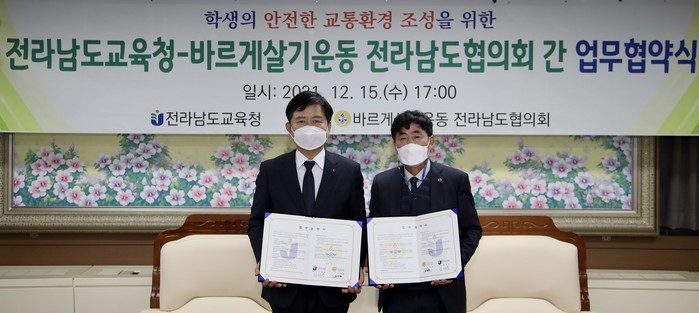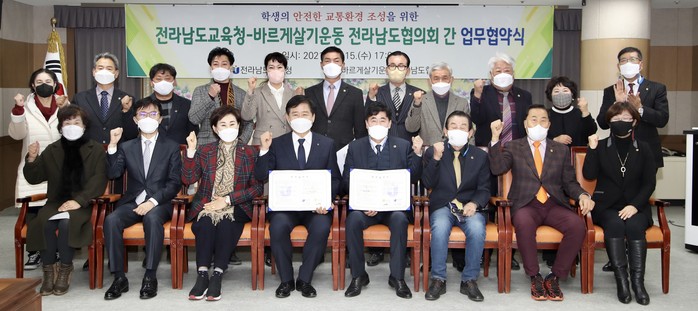 [세계로컬타임즈 김명진 기자] 전라남도교육청(교육감 장석웅)과 바르게살기운동 전라남도협의회(회장 주상윤)가 15일 전라남도교육청 비즈니스실에서‘학생의 안전한 교통환경 조성’을 위한 업무협약을 체결했다.