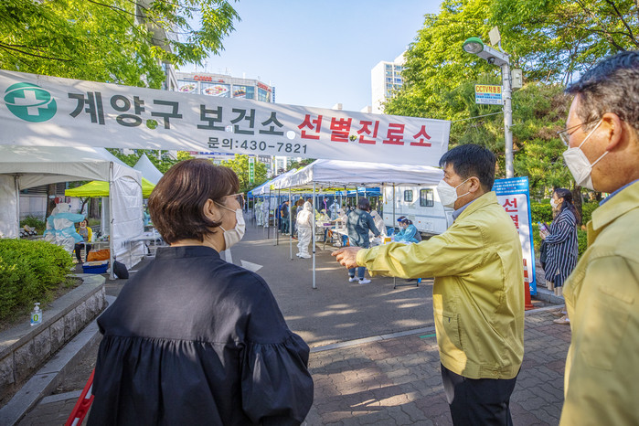 | ▲ 박형우 구청장이 보건소 코로나19 선별진료소를 방문 점검하고 있다. (사진=계양구 제공) |