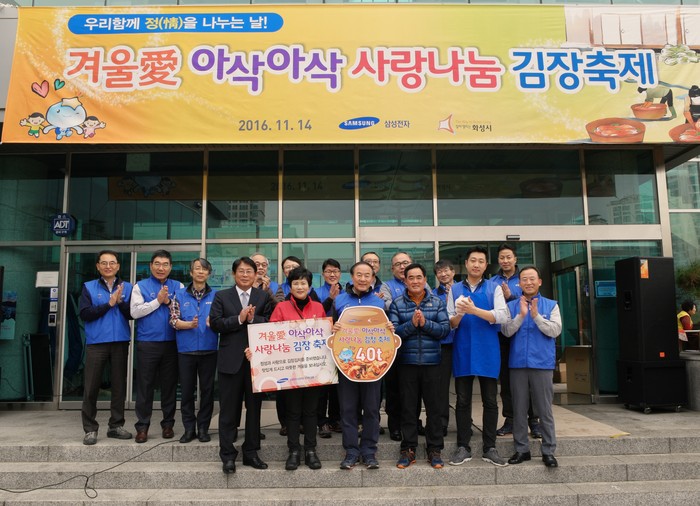 [세계로컬신문 최원만 기자] 지난14일 오전 삼성전자 DS부문 임직원과 주민봉사자가 참여하는 ‘2016 사랑나눔 김장축제’가 화성시 향남읍에 위치한 ‘화성시자원봉사센터’ 앞마당에서 열렸다.