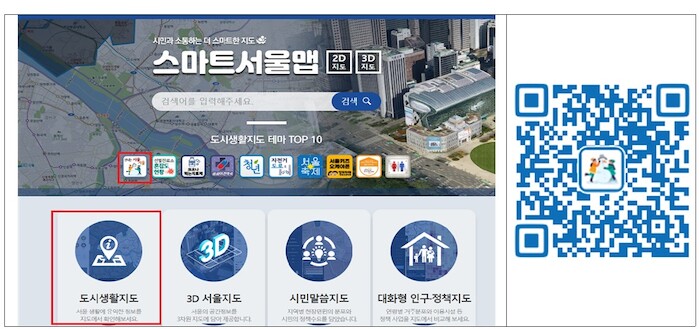 한편 ‘스마트서울맵’에서는 복지·문화·경제·교통 등 다양한 주제의 도시생활지도 350여 종을 서비스하고 있다. 또한 시민참여지도, 3D서울지도, 대화형 인구·정책지도, Open API 등 다양한 기능을 제공하고 있다.