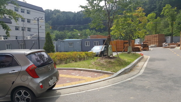 | ▲ 대학교 주차장에 부속건물 신축공사 현장에 사용하는 컨테이너와 자재들이 적재돼 있다. |