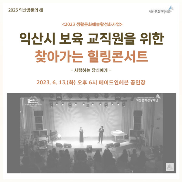 10일 익산문화관광재단에 따르면 ‘찾아가는 힐링콘서트’는 생활문화예술활성화사업의 일환으로 생활 속 문화 향유의 기회가 적은 시민들을 위해 다양한 문화예술프로그램을 운영하며 행복을 느낄 수 있게 하는 것이 목적이다.