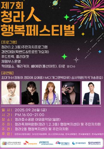 ‘청라人 행복 페스티벌’은 청라1․2․3동 행정복지센터와 주민자치회가 공동으로 추진하는 청라 주민 화합의 장으로, 2016년부터 매년 가을 청라호수공원 야외음악당에서 열리고 있다.