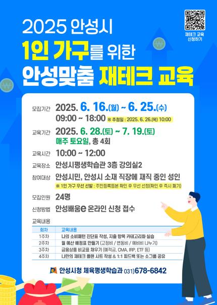 안성시 관계자는 “이번 교육을 통해 1인 가구가 실생활에서 활용 가능한 재무 지식을 쌓고, 경제적 자립 기반을 다지는 계기가 되길 바란다”며 “앞으로도 더 많은 시민이 참여할 수 있도록 교육 기회를 확대해 나가겠다”라고 말했다.