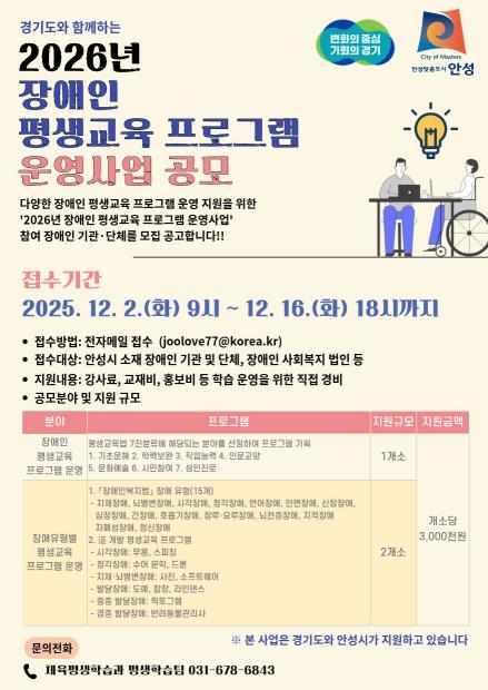 신청 대상은 안성시에 주소(등록)를 둔 장애인 평생교육 기관‧단체이며, 신청 기간은 12월 2일부터 16일까지이다. 모집 규모는 ▲평생교육법 제7진 분류를 기반으로 한 ‘장애인 평생교육 프로그램’ 1개소와 ▲'장애인복지법'에 따른 15개 장애 유형 분류를 기반으로 한 ‘장애유형별 평생교육 프로그램’ 2개소, 총 3개소이다. 선정된 프로그램은 2026년 2월부터 10월까지 운영될 예정이다.